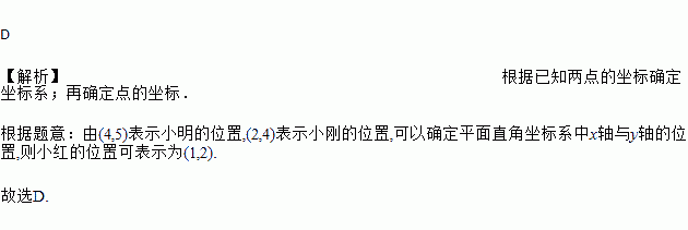 如图,是做课间操时,小明,小刚和小红三人的相对位置,如果用(4,5)表示小明的位置,(2,4)表示小刚的位置,则小红的位置可表示为( )