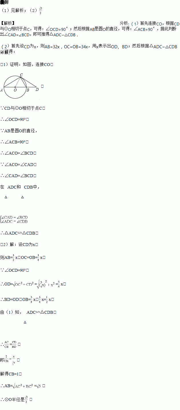 (2)若AC=2,AB=CD,求⊙O半径.