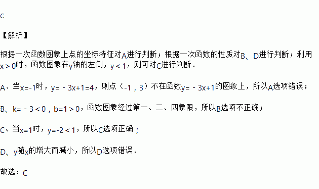 对于函数y=﹣3x+1,下列结论正确的是( )