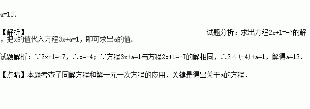 已知关于x的方程3x+a=1与方程2x+1=-7的解相同,求a的值.
