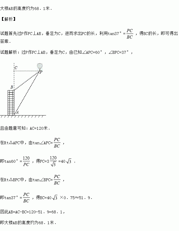 如图,利用热气球探测器测量大楼AB的高度.从热气球P处测得大楼顶部B的俯角为37°,大楼底部A的俯角为60°,此时热气球P离地面的高度为120m.试求大楼AB的高度(精确到0.1m).(参考数据:sin37°≈0.60,cos37°≈0.80,tan37°≈0.75,
