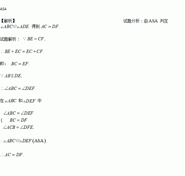 如图,已知点E、C在线段BF上,BE=CF,AB∥DE,∠ACB=∠F.求证:AC=DF.