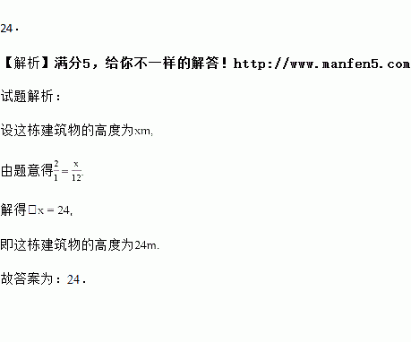 在某一时刻,测得一根高为2m的竹竿的影长为1m,同时测得一栋建筑物的影长为12m,那么这栋建筑物的高度为 m.