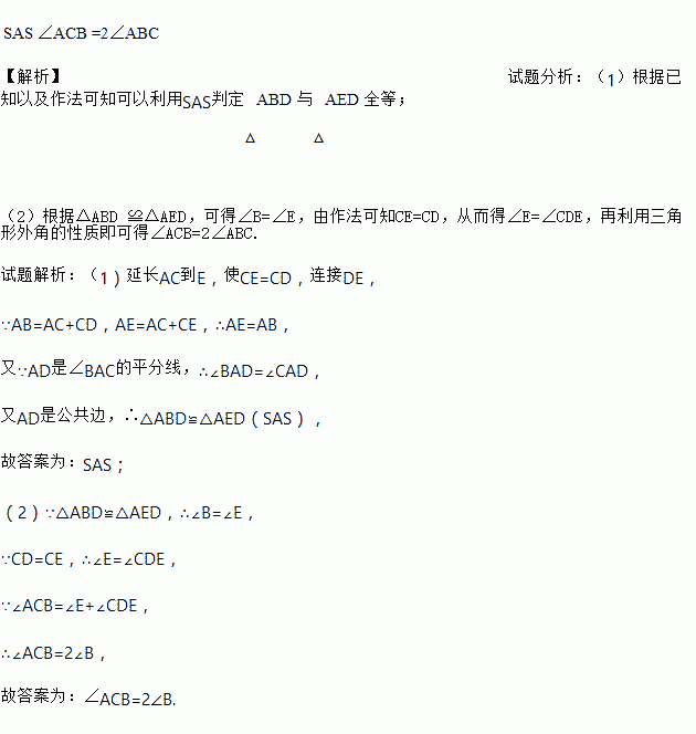如图2,延长AC到E,使CE=CD,连接DE,由AB=AC+CD,可得AE=AB,又因为AD是∠BAC的平分线,可得△ABD≌△AED,进一步分析就可以得到∠ACB 与∠ABC的数量关系.