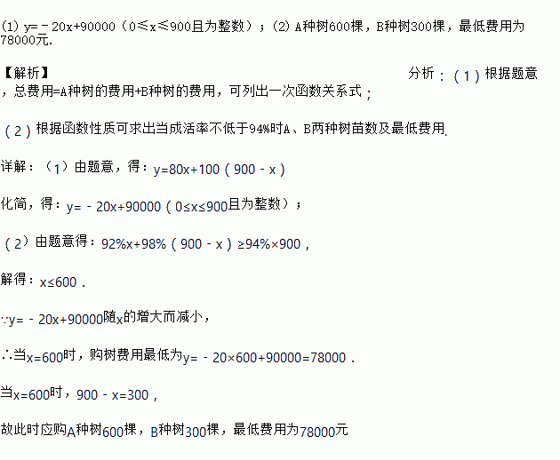 (2)若希望这批树的成活率不低于94%,且使购树的总费用最低,应选购A、B两种树各多少棵?此时最低费用为多少?