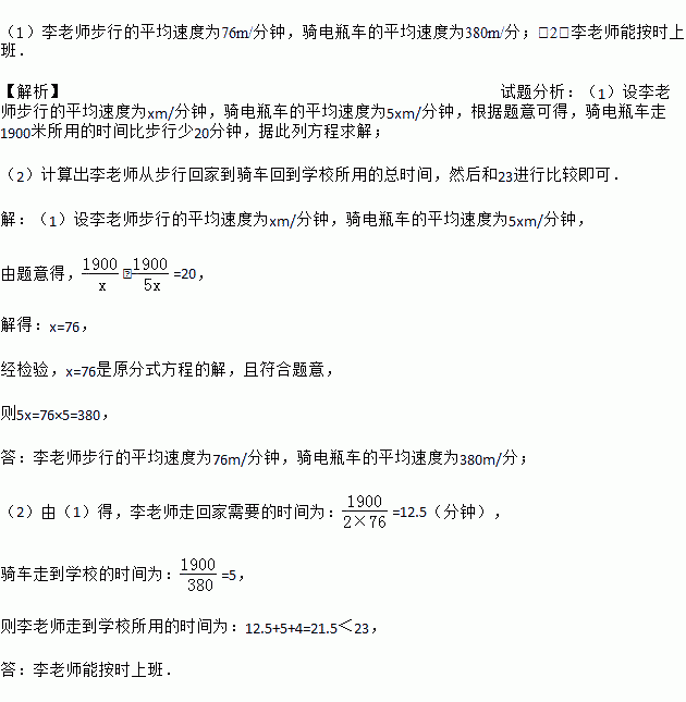 李老师家距学校1900米,某天他步行去上班,走到路程的一半时发现忘带手机,此时离上班时间还有23分钟,于是他立刻步行回家取手机,随后骑电瓶车返回学校.已知李老师骑电瓶车到学校比他步行到学校少用20分钟,且骑电瓶车的平均速度是步行速度的5倍,李老师到家开门、取手机、启动电瓶车等共用4分钟.