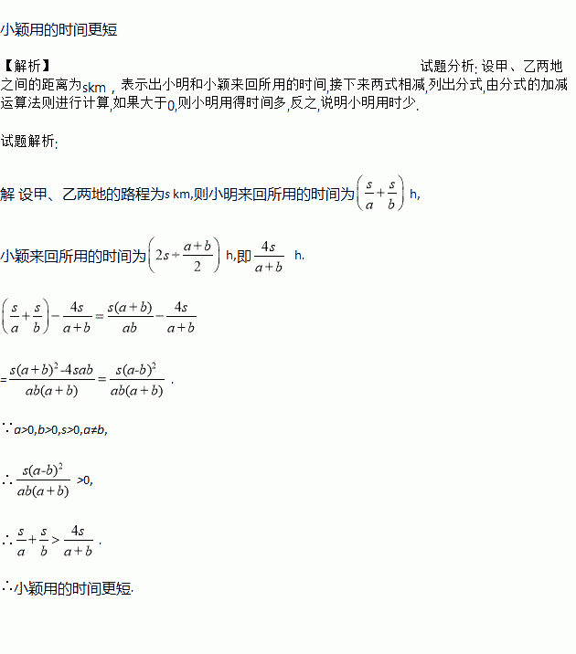 小明从甲地到乙地的速度是a km/h,从乙地到甲地的速度是b km/h(a≠b);小颖从甲地到乙地,又从乙地回到甲地,速度均为 km/h.请问小明和小颖比,谁用的时间更短?