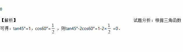 计算:tan45°﹣2cos60°=________.