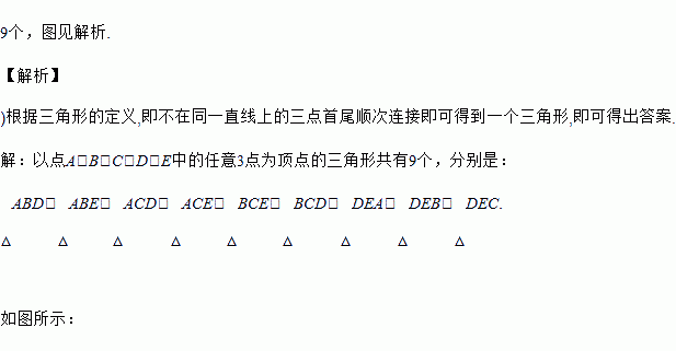 如图,以点A、B、C、D、E中的任意3点为顶点的三角形共有几个,请在图中画出这些三角形.