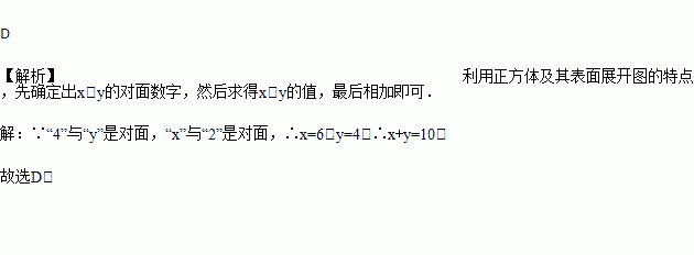 如图,该平面展开图按虚线折叠成正方体后,相对面上两个数之和为8,则x+y的值是( ).