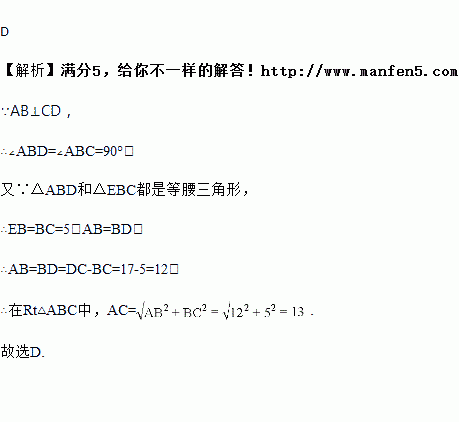 如图,AB⊥CD于B,△ABD和△BCE都是等腰直角三角形,如果CD=17,BE=5,那么AC的长为( ).