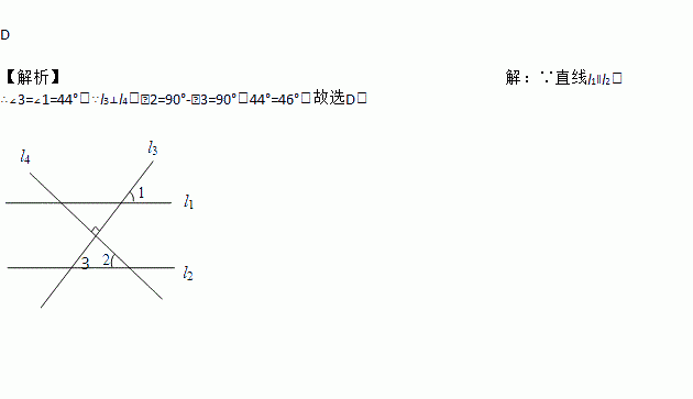 D 【解析】【解析】 ∵直线l1∥l2,∴∠3=∠1=44°.∵l3⊥l4,∠2=90°-∠3=90°-44°=46°.故选D.