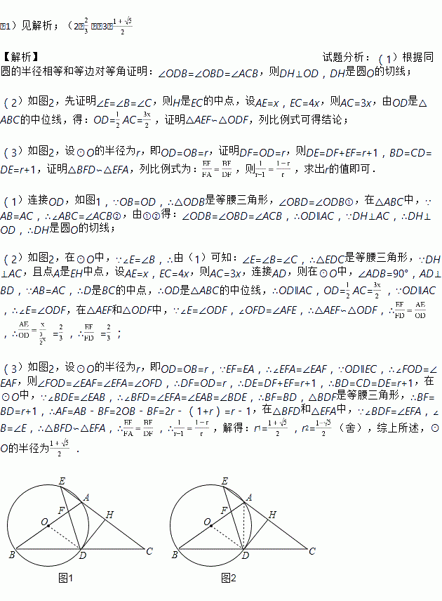 如图,在△ABC中,AB=AC,以AB为直径作圆O,分别交BC于点D,交CA的延长线于点E,过点D作DH⊥AC于点H,连接DE交线段OA于点F.