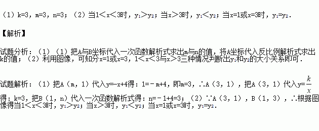 如图,函数y1=﹣x+4的图象与函数y2=(x>0)的图象交于A(m,1),B(1,n)两点.