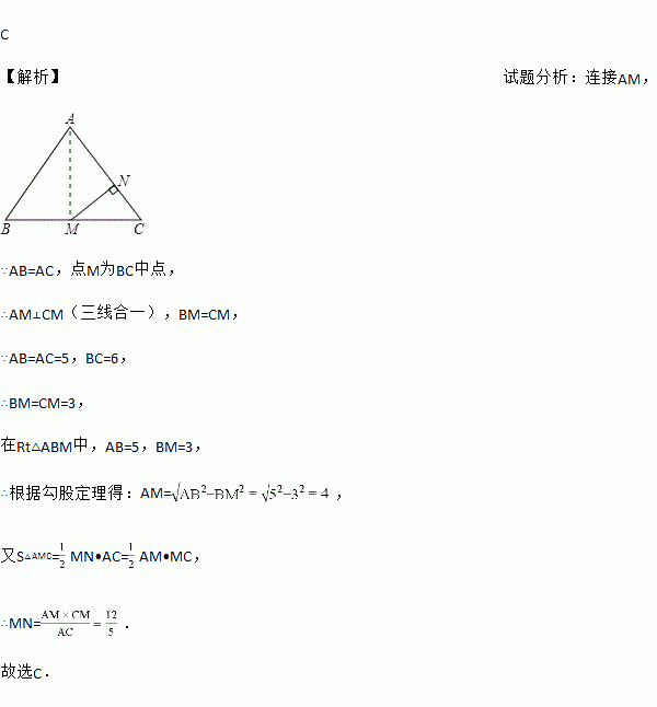 如图,在△ABC中,AB=AC=5,BC=6,点M为BC的中点,MN⊥AC于点N,则MN等于( )
