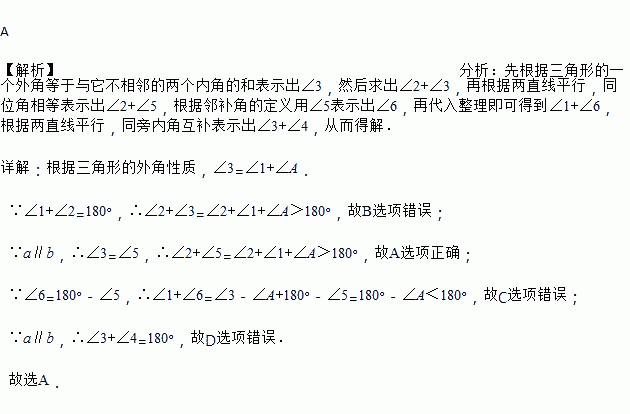 如图,直线a、b分别与∠A的两边相交,且a∥b.下列各角的度数关系正确的是( )