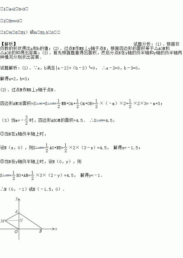 时,在坐标轴的负半轴上是否存在点N,使得四边形ABOM的面积与△ABN的面积相等?若存在,求出点N的坐标;若不存在,请说明理由.