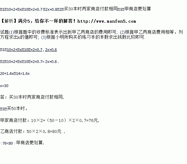 (1)设小明要购买x(x>10)本练习本,则当小明到甲商店购买时,须付款 元,当到乙商店购买时,须付款 元;