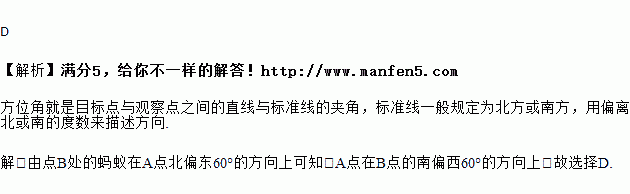 如图,点A,B各有一只小蚂蚁,点B处的蚂蚁在A点北偏东60°的方向上,则点A处的蚂蚁在B点 ( )