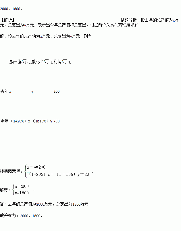 某工厂去年的利润(总产值﹣总支出)为200万元,今年总产值比去年增加了20%,总支出比去年减少了10%,今年的利润为780万元,去年的总产值为 万元,总支出是 万元.