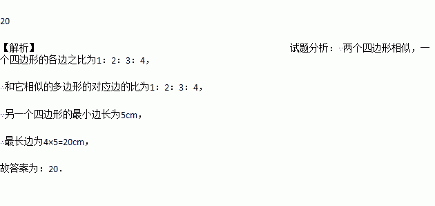 一个四边形的各边之比为1:2:3:4,和它相似的另一个四边形的最小边长为5cm,则它的最大边长为_____cm.