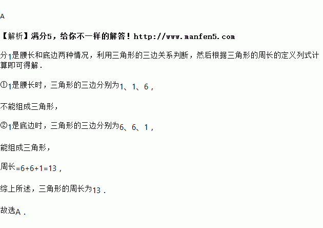 已知等腰三角形的两边长分别为 6 和 1,则这个等腰三角形的周长为( )