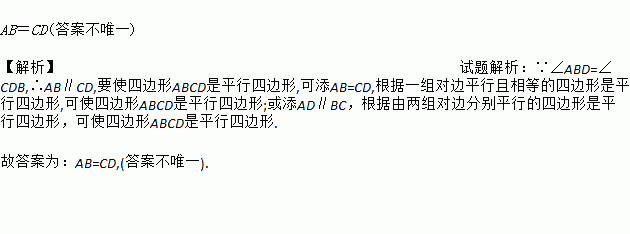 在四边形ABCD中,BD是对角线,∠ABD=∠CDB,要使四边形ABCD是平行四边形只需添加一个条件,这个条件可以是____________.