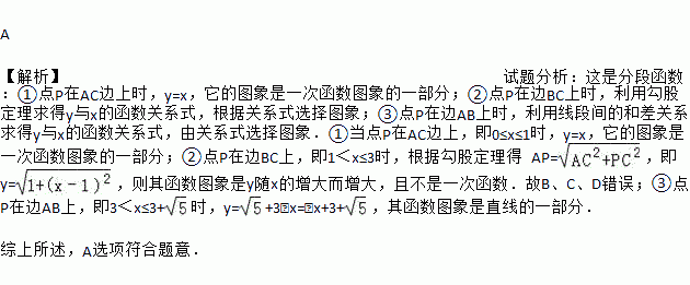 如图,在Rt△ABC中,∠C=90°,AC=1cm,BC=2cm,点P从点A出发,以1cm/s的速度沿折线AC→CB→BA运动,最终回到点A,设点P的运动时间为x(s),线段AP的长度为y(cm),则能够反映y与x之间函数关系的图象大致是( )