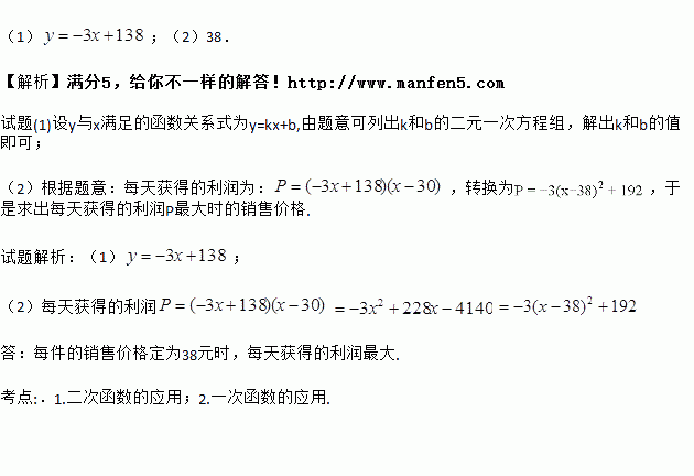 在2014年“元旦”前夕,某商场试销一种成本为30元的文化衫,经试销发现,若每件按34元的价格销售,每天能卖出36件;若每件按39元的价格销售,每天能卖出21件.假定每天销售件数y(件)是销售价格x(元)的一次函数.
