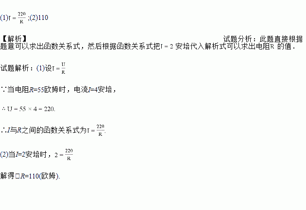 在某一电路中,保持电压不变,电流I(安培)与电阻R(欧姆)成反比例,当电阻R=55欧姆时,电流I=4安培.