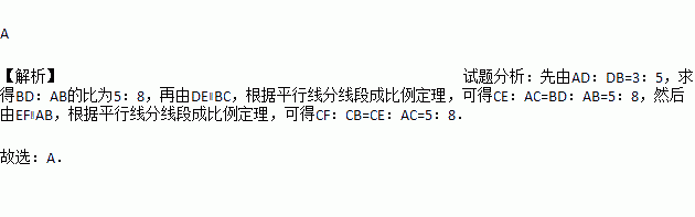 如图,在△ABC中,点D,E,F分别是边AB,AC,BC上的点,DE∥BC,EF∥AB,且AD∶DB=3∶5,那么CF∶CB的值为( )
