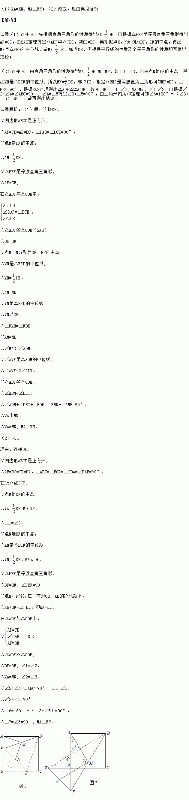 把一个含45°角的直角三角板BEF和一个正方形ABCD摆放在一起,使三角板的直角顶点和正方形的顶点B重合,联结DF,点M,N分别为DF,EF的中点,联结MA,MN.