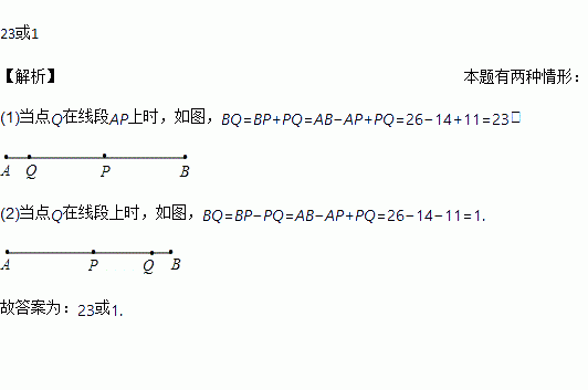 若线段AB上有P,Q两点,AB=26,AP=14,PQ=11,那么BQ= _______.