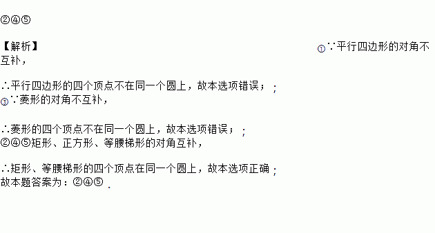 下列图形中:①平行四边形;②矩形;③菱形;④正方形;⑤等腰梯形.其中四个顶点在同一圆上的有___________(只填序号即可).