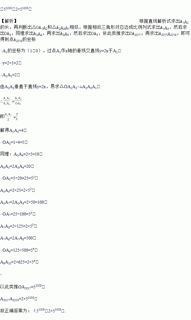 如图,在直角坐标系中点A1的坐标为(1,0),过点A1作x轴的垂线交直线y=2x于A2,过点A2作直线y=2x的垂线交x轴于A3,过点A3作x轴的垂线交直线y=2x于A4…,依此规律,则A2018的坐标为____.