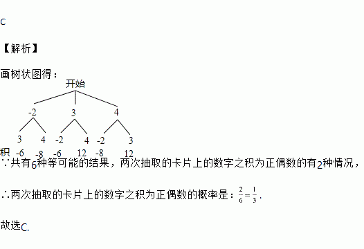 有三张正面分别标有数字-2 ,3, 4 的不透明卡片,它们除数字不同外,其余全部相同,现将它们背面朝上洗匀后, 从中任取一张(不放回),再从剩余的卡片中任取一张, 则两次抽取的卡片上的数字之积为正偶数的概率是( )