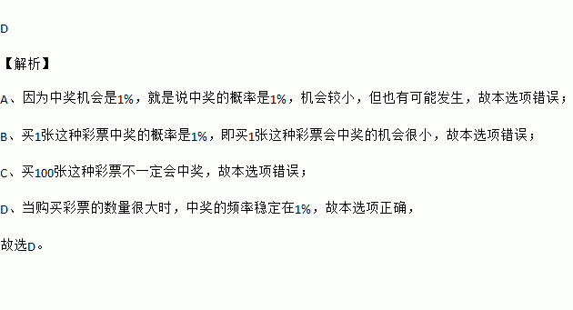 D. 当购买彩票的数量很大时,中奖的频率稳定在1%