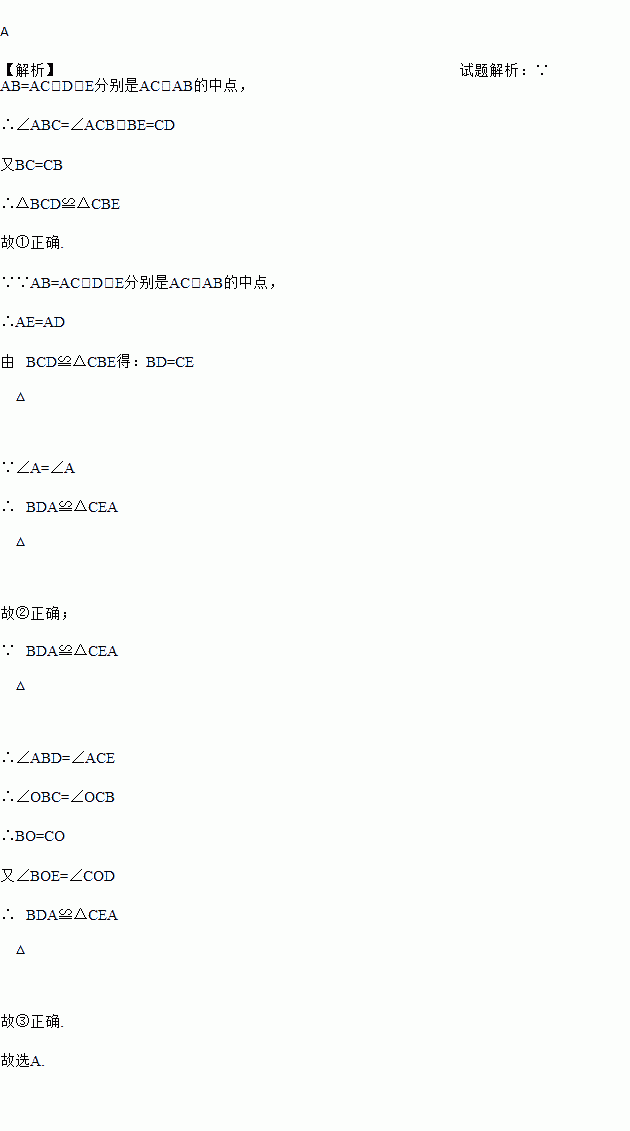 如图所示,在△ABC中,AB=AC,D、E分别是AC、AB的中点,且BD,CE相交于O点,某一位同学分析这个图形后得出以下结论: ①△BCD≌△CBE; ②△BDA≌△CEA; ③△BOE≌△COD; ④△BAD≌△BCD;⑤△ACE≌△BCE,上述结论一定正确的是( )