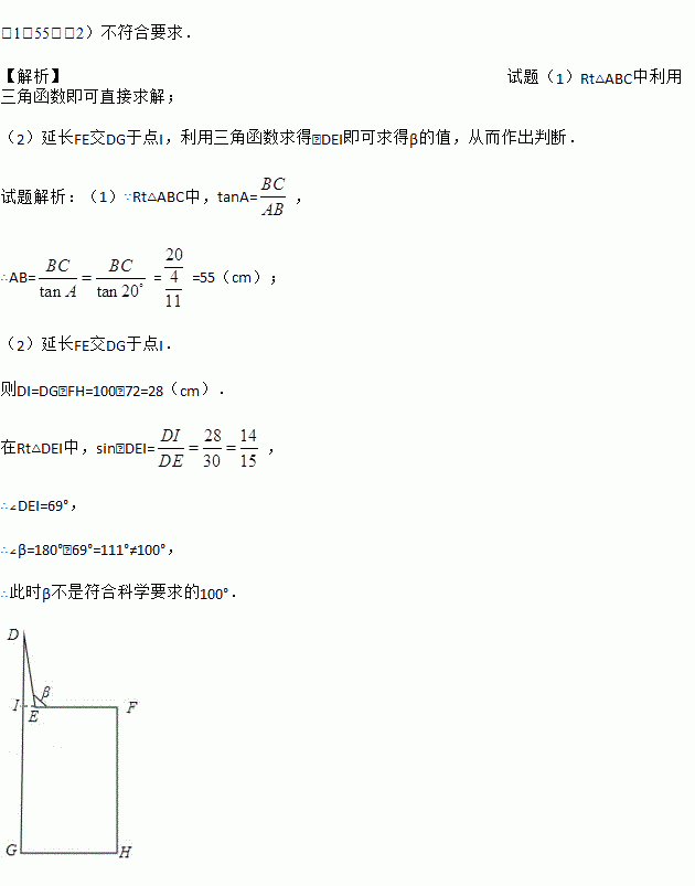(2)若肩膀到水平地面的距离DG=100cm,上臂DE=30cm,下臂EF水平放置在键盘上,其到地面的距离FH=72cm.请判断此时β是否符合科学要求的100°?