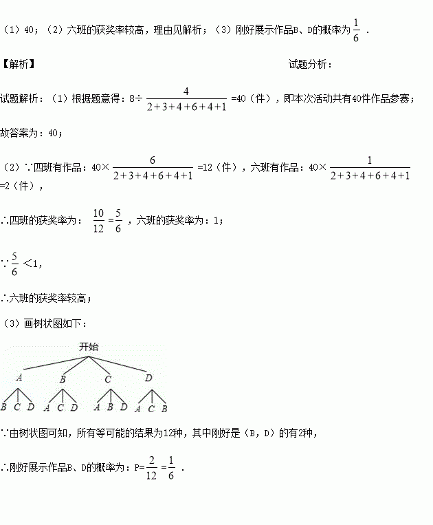 (2)经评比,四班和六班分别有10件和2件作品获奖,那么你认为这两个班中哪个班获奖率较高?为什么?