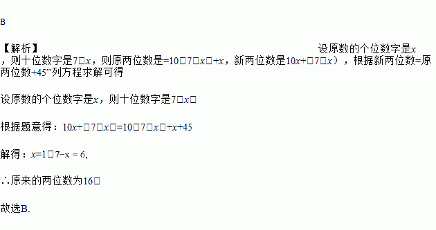 一个两位数的十位数字与个位数字之和是7,如果这个两位数加上45,恰巧等于原数的个位数字与十位数字对调后所得的两位数,则原来的两位数是 ( )