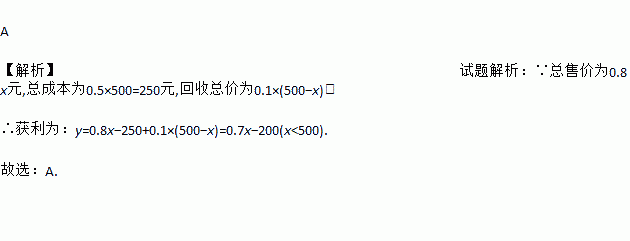 某报亭老板以每份0.5元的价格从报社购进某种报纸500份,以每份0.8元的价格销售x 份(x<500),未销售完的报纸又以每份0.1元的价格由报社收回,这次买卖中该老板获利y 元,则y与x的函数关系式为( )
