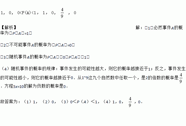 (4)随机事件的概率的规律:事件发生的可能性越大,则它的概率越接近于_____________;反之,事件发生的可能性越小,则它的概率越接近于_____________.从1~9这九个自然数中任取一个,是2的倍数的概率是_____________.方程5x=10的解为负数的概率是_____________.