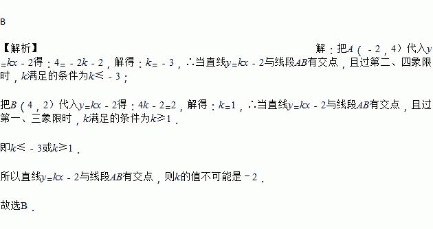 在平面直角坐标系中,线段AB的端点坐标为A(-2,4),B(4,2),直线与线段AB有交点,则k的值不可能是( )
