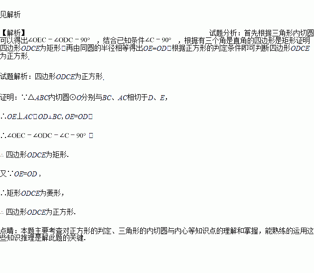 已知:如图,∠C=90°,内切圆O分别与BC、AC相切于点D、 E, 判断四边形ODCE的形状,并说明理由。