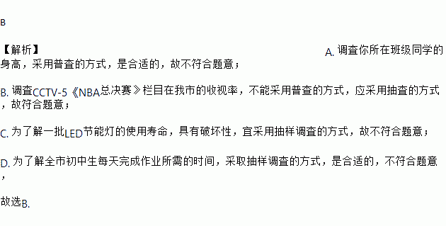 B. 调査CCTV-5《NBA总决赛》栏目在我市的收视率,采用普査的方式