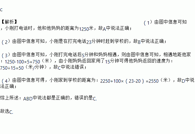 早晨,小刚沿着通往学校唯一的一条路(直路)上学,途中发现忘带饭盒,停下来往家里打电话,妈妈接到电话后带上饭盒马上赶往学校,同时小刚返回,两人相遇后,小刚立即赶往学校,妈妈回家,15分钟后妈妈到家,再经过3分钟小刚到达学校,小刚始终以100米/分的速度步行,小刚和妈妈的距离y(单位:米)与小刚打完电话后的步行时间t(单位:分)之间的函数关系如图,下列四种说法中错误的是( )