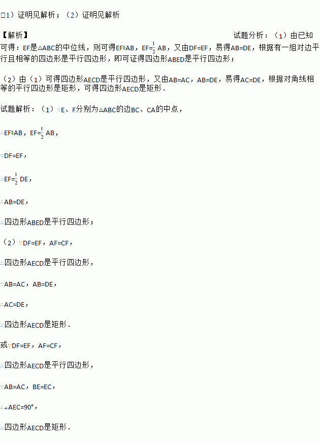 如图,E、F分别为△ABC的边BC、CA的中点,延长EF到D,使得DF=EF,连接DA、DB、AE.