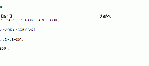 如图,AB与CD交于点O,OA=OC,OD=OB,∠A=50°,∠B=30°,则∠D的度数为( )