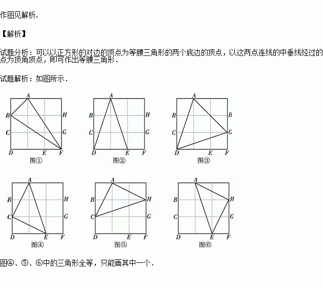 在正方形网格图①、图②中各画一个等腰三角形.要求:每个等腰三角形的一个顶点为格点A,其余顶点从格点B、C、D、E、F、G、H中选取,并且所画的两个三角形不全等.
